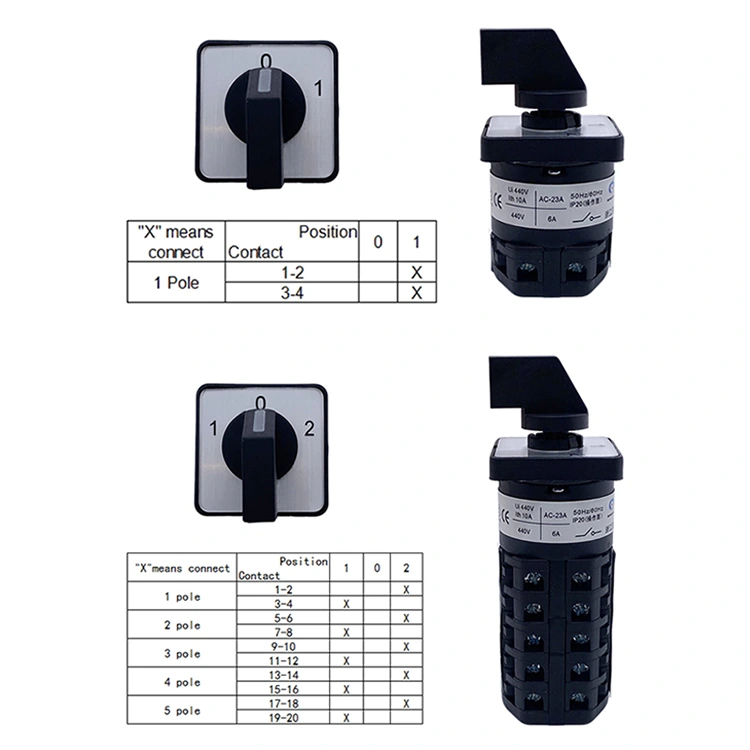 10A Three Positions Cam Switch is compact in size and can be flexibly arranged in limited installation space; it has rich functions to meet various control requirements; compact in structure and rigorous in material selection to ensure good insulation performance and ensure power safety.At the same time, the switch conversion operation is flexible and smooth, the safety and reliability are high, the appearance is novel, and the utility model is both practical and beautiful, and the appearance design of different equipment is adapted.