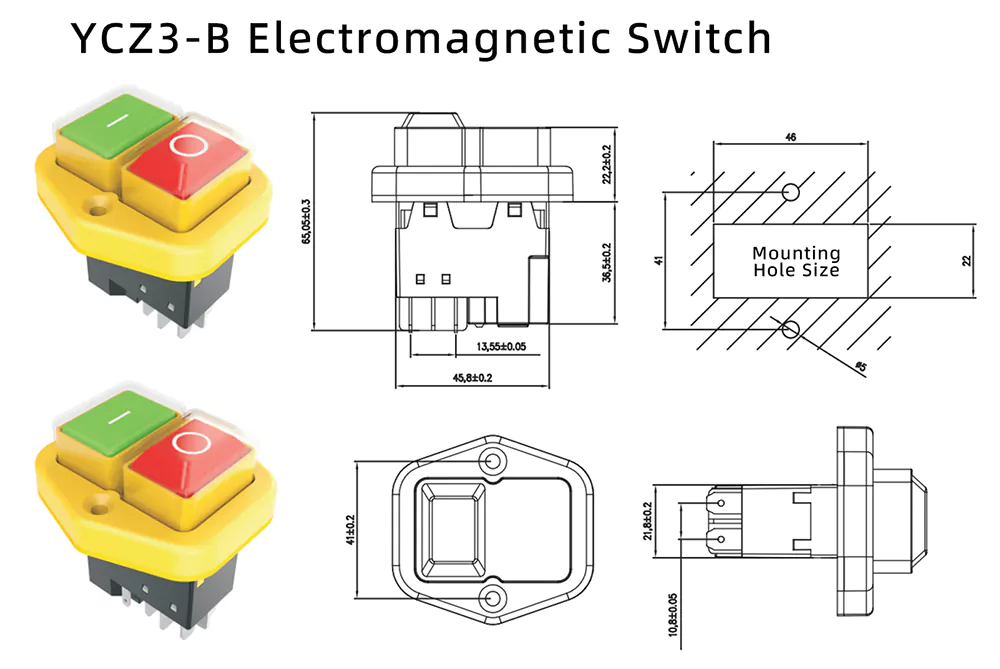 Model YCZ3-B, the 16A Yellow Wide Diamond Push Button Electromagnetic Switch, is produced with sophisticated craftsmanship and strict overall quality control. Long service lifespan, superior heavy-load performance and excellent waterproof & dustproof sealing are its core advantages. Pre-set external plug terminals enable fast matching with thermal overload devices, limit switches, temperature control components and sensors for all-round circuit safety protection. It realizes rapid main power cutoff during mechanical abnormalities, greatly preventing industrial safety accidents.