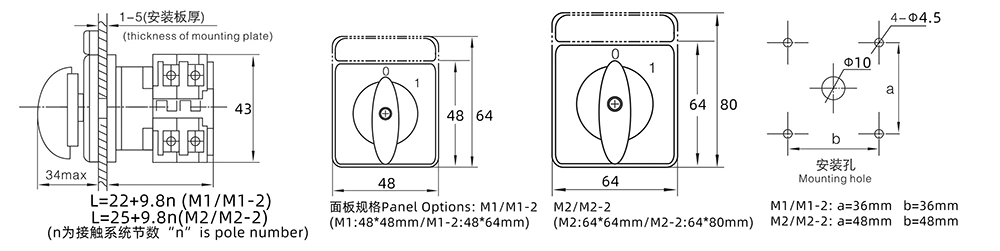 In order to meet the specific needs of different customers, we have established a perfect classification and customization system.The switch can be divided into main circuit conversion, motor control, main command control and measurement according to the purpose; the operation mode covers positioning type, self-resetting type and positioning self-resetting type; the number of system sections can be flexibly selected according to positioning type (1-12 sections), self-resetting type (1-3 sections) and motor control type (1-6 sections), and special section customization is supported.The conversion angle provides 30°, 45°, 60°, 90° options, and the panel can also be adapted to square, circular, etc. shapes, truly changing according to needs.